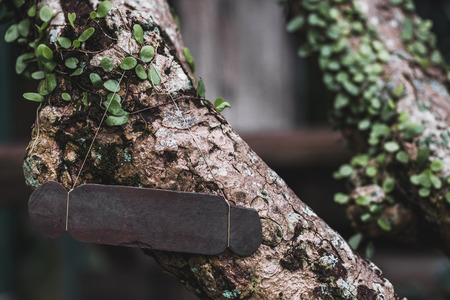 Empty wooden nameplate on tree. Vintage textured style and place for text, sign or logo. Eco and natural