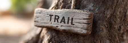 Close up of weathered wooden trail sign hanging from a tree, inviting hikers to explore natures path during their summer camping adventure