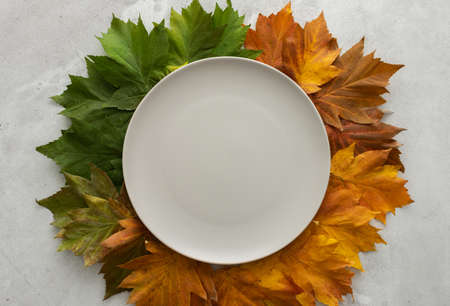 Autumn table setting, green, red and yellow fallen maple leaves and an empty plate, thanksgiving holiday