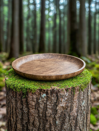 This image features an elegant round ceramic plate resting on a beautifully textured wooden surface, highlighting organic patterns and warm tones under soft lighting.