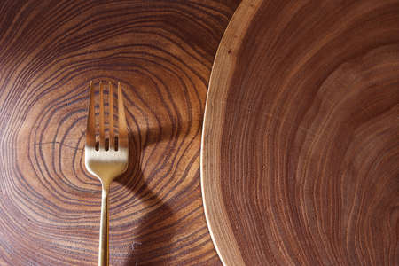 The golden fork lies on a slice of a tree. wooden table. High quality photo