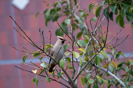 Bohemian waxwing, Latin name Bombycilla garrulus, sitting on the branch in autumn or winter day. The waxwing, a beautiful tufted bird, sits on a branch without leaves. Wild bird. Latin name Bombycilla garrulus