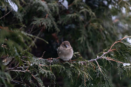 female of small beautiful bird house sparrow, Passer domesticus, bird sitting on the tree branch in winter garden