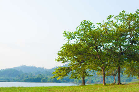 Beautiful landscape of lake and tree in the morning with sunlight.