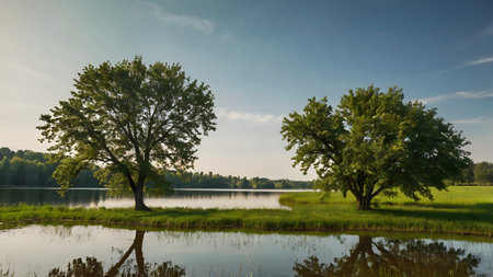Lakeside Trees A Serene Summer Landscape.