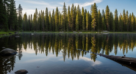 Green pine forest by a calm lake, with reflections of the trees on the water