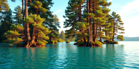 Explore a tranquil lake scene featuring vibrant pine trees surrounded by sparkling turquoise water, under a clear blue sky, perfect for relaxation.