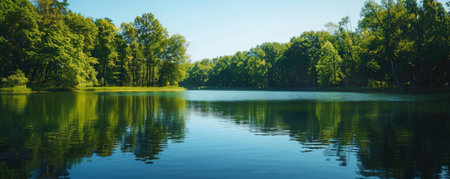 Peaceful lake background with calm water, green trees, and textured reflections. The serene, natural scene creates a tranquil, picturesque atmosphere, perfect for nature or wellness themes