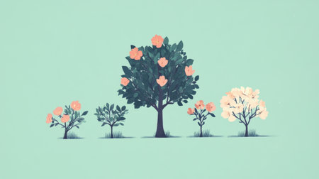 Visual roadmap of a tree growing from a sapling to full bloom, representing stages of natural evolution and growth, flat design.