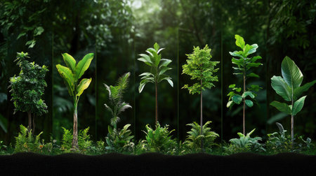 Explore the captivating diversity of lush green plants and trees found in a tropical rainforest. This vibrant imagery captures the beauty of nature, showcasing various leafy textures and forms that contribute to a rich ecosystem. Perfect for themes of ecology and relaxation.
