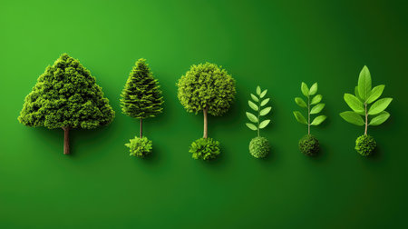 A vibrant collection of stylized trees and leaves displayed against a rich green background, perfect for highlighting themes of nature and environmental consciousness.