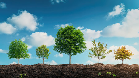 Growth illustration of trees from small to big, leafy development stages shown in sequence on a clean backdrop