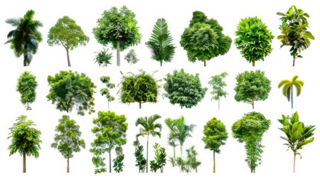 A diverse collection of green trees and plants displayed against a white background, showcasing the richness and variety of nature.