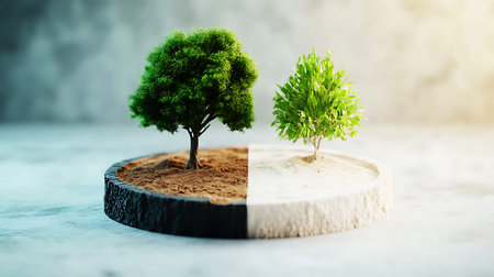 Conceptual image of green trees growing on a piece of soil