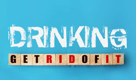 phrase Drinking - get rid of it on sky blue abckground and on wooden cubes with letters. Top view. Fight Addictions concept.