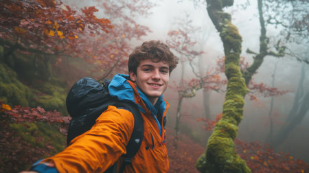 A young man captures a cheerful self-portrait in a mystical forest filled with colorful autumn leaves. He wears an orange jacket and smiles at the camera, enjoying nature's beauty.