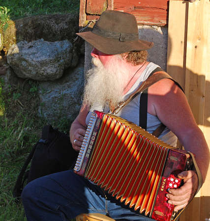 Street performer playing music on a vintage accordion squeeze box