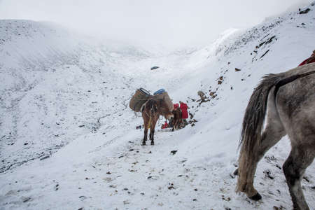 Zanskar, India - July 2021: A man herding a group of pack mules and ponies through the snow trail in the high altitude wilderness of the Himalayan region of Zanskar.