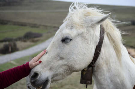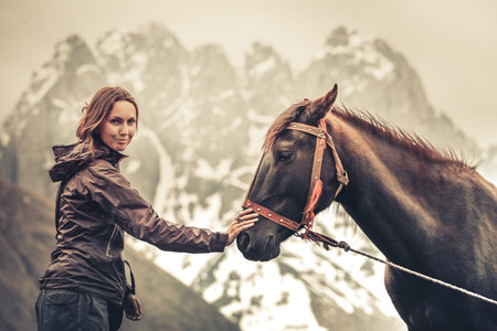 Portrait of young pretty cheerful woman with horse in mountain valley. Horse and girl outdoors, womans hand makes a friendly gesture to a horse by stoking its head. Vintage Color filter toning