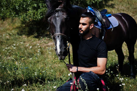 Arab tall beard man wear in black with arabian horse.