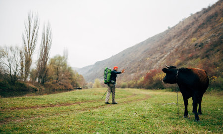Landscape view image of tourist young man hiking in mountains with travel backpack. Traveler man trekking during his journey, looking to the cow, explore nature. Travel, people, healthy lifestyle