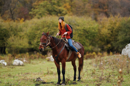 woman hiker ride horse mountains travel fresh air