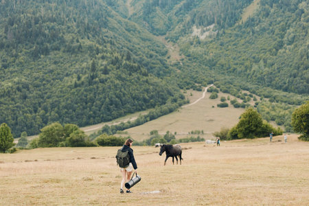 A route through mountain peaks and hills through majestic landscapes with horses in the distance. Active tourists, hiking, Caucasus Mountains Oshten Fisht. Sport lifestyle concept