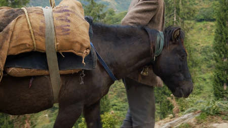 Laden mules in Himalaya somewhere in Uttarakhand, India.