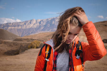 Attractive Jewish young woman with a backpack in the mountains. Runs her hand through her hair while straightening her hair in the wind against the backdrop of a mountain landscape