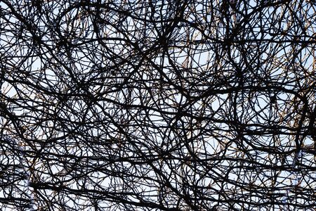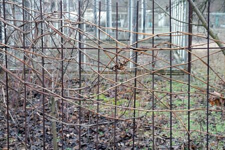 part of the lattice in a fence of black iron rods overgrown with dry gray branches of a plant on the street