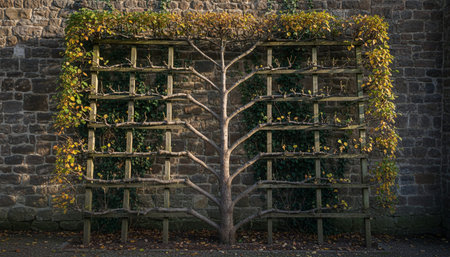 white wall covered with wooden bars and covered with ivy