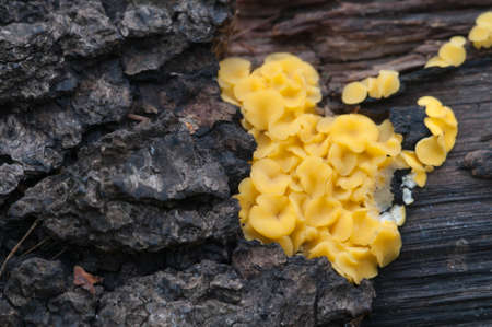 Close-up of yellow mushroom called Tremella mesenterica on a dead white Birch trunk. Popular names are yellow brain, golden jelly fungus, yellow trembler