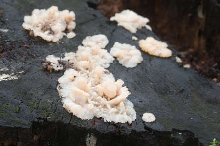 Wood ear mushroom on old wood log in the rain forest landscape.