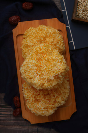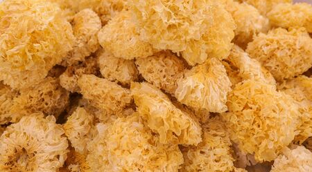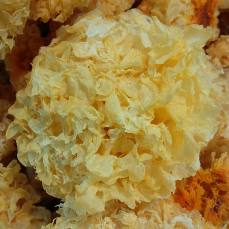 Pile of yellow dry Chinese mushrooms for cooking on market