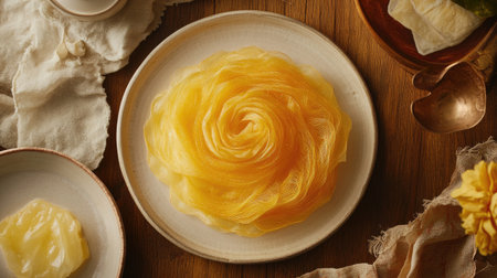An artistic presentation of yellow silk strands shaped like a flower on a plate, perfect for food, cooking inspiration, and creative culinary designs.