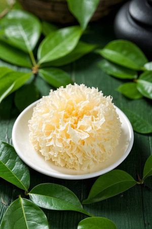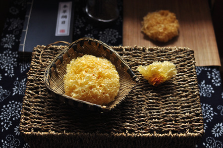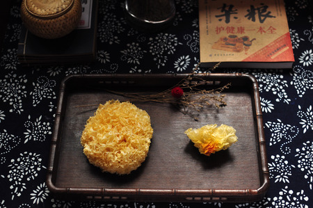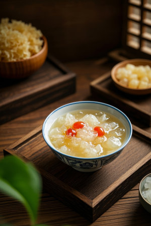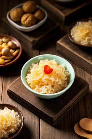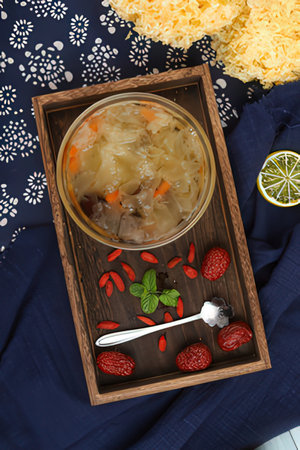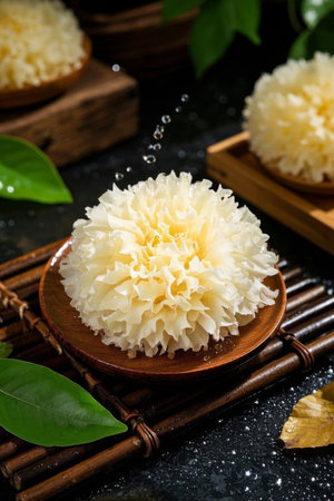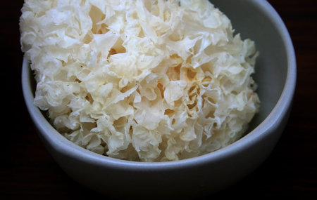 Close up of a still life of Chinese bowl shaped Tremella fuciformis soup