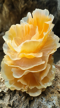 Macro image showcasing a stack of golden oyster mushrooms perched atop a weathered piece of wood, beautifully highlighting the mushroom's delicate, layered structure.