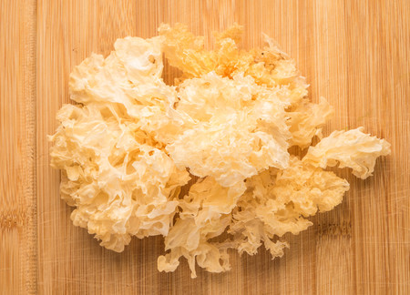 Fresh White Fungus (Tremella fuciformis) on Brown Wooden Table, Isolated