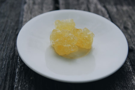 Crystal rock sugar on top of a white plate placed on a wooden table, usually used at a traditional cafe or restaurant.