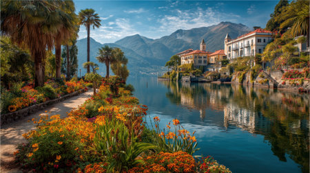 Villa Carlotta boasts beautifully blooming gardens that reflect in Lake Como's tranquil waters, framed by the picturesque Lombardy mountains under a bright sky.