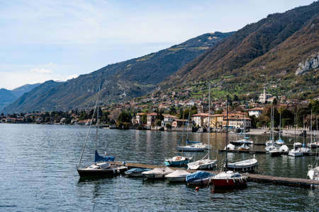 Pier with moored yachts near the town. Lake Como, Italy