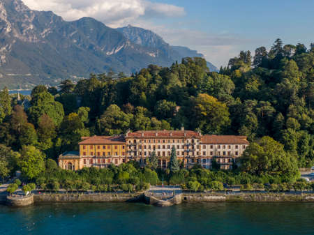 Town of Belaggio waterfront villas on Como lake aerial view, Lombardy region of Italy