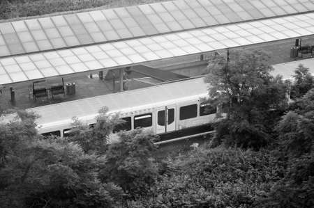 BERLIN, GERMANY - CIRCA JUNE 2016: S-bahn (meaning S-train), abbreviation of Stadtbahn (meaning City train) electrified hybrid urban and suburban railway in black and white