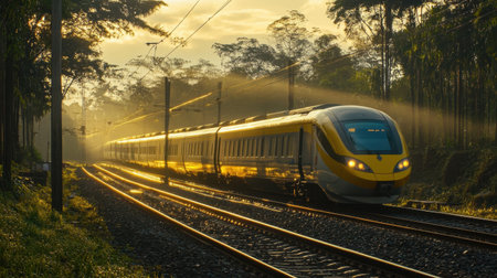A vibrant EMU train glimmers under sunlight in a serene morning setting. The golden rays create an enchanting atmosphere along the railway tracks.