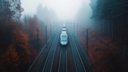 A sleek train travels through a misty forest, showcasing nature's beauty in autumn. The serene atmosphere creates a perfect backdrop for travel and exploration.