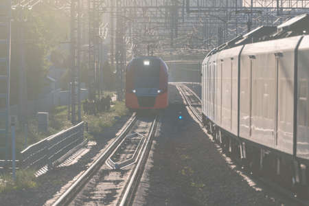 train passing by on railroad tracks at sunset, featuring a light gray and red color scheme. this photo captures the essence of working-class empathy with its streamlined forms, metallic finishes, and soft-focus portraits. the innovative techniques used create a serene atmosphere, enhancing the overall aesthetic appeal. ai generated