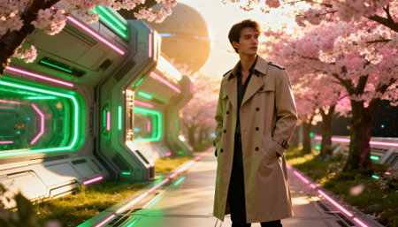 Man walking along a glowing neon pathway in a futuristic park with cherry blossom trees and a distant planet in the sky. Cinematic lighting and soft background create space for text and branding