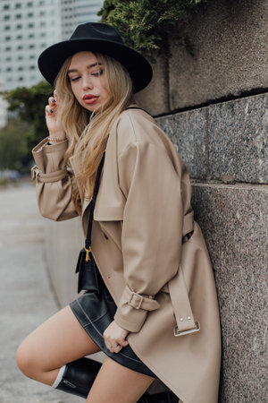 Woman in stylish trench coat and hat looking at camera while posing outdoors on the street.