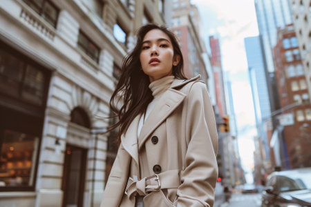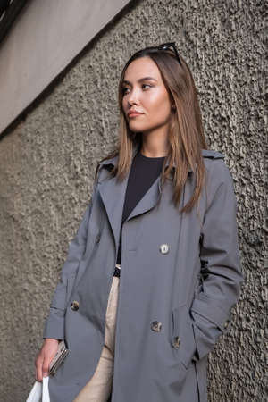 attractive young asian model in gray trench coat standing near wall outdoors