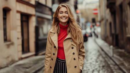 portrait of happy woman in beige trench coat smiling outside